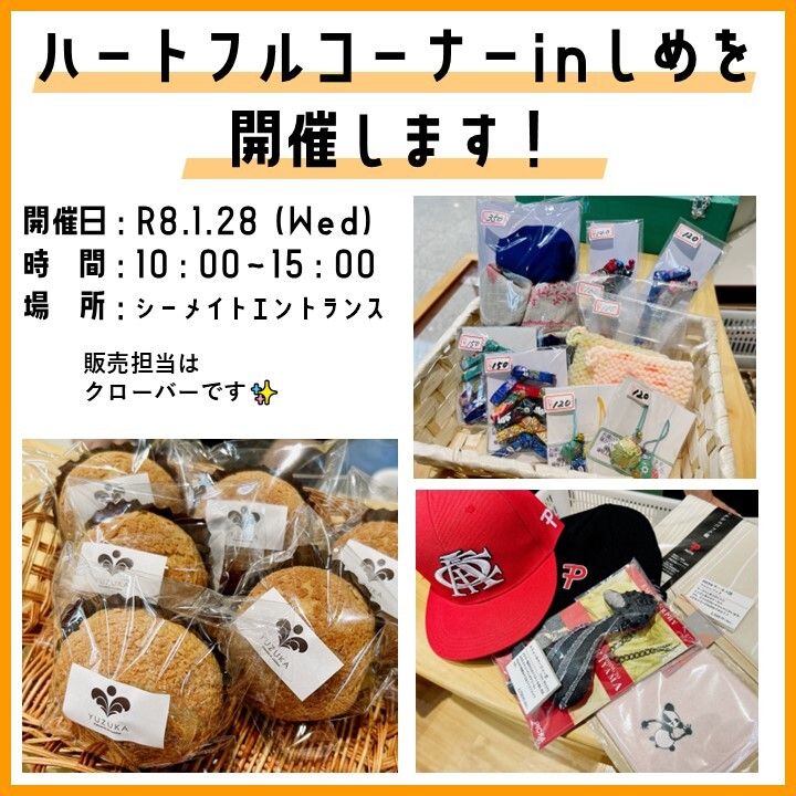 ※『ハートフルコーナーinしめ』で、一緒に活動をしていただけるボランティアを募集しています!主な活動内容は、「まごころ製品」の販売です。個人のご予定に合わせて活動時間等の調整も可能です。